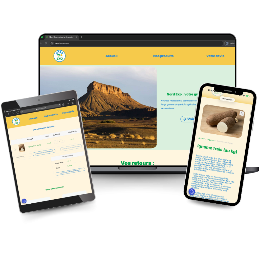 Nord Exo, grossiste et épicerie de produits africains et asiatiques installé au cœur de Wazemmes à Lille, avait besoin d’une présence digitale capable de parler à deux cibles à la fois : les professionnels (restaurants, épiceries) qui commandent en gros, et les particuliers qui achètent au détail. Création du site, SEO local et accompagnement en communication : un projet complet pour ancrer Nord Exo comme la référence exotique de la métropole lilloise.
